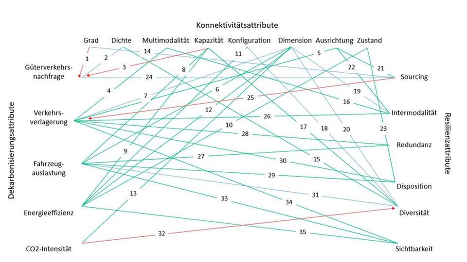 Im Rahmen der Analyse konnte ich insgesamt 19 Attribute identifizieren, die für Dekarbonisierung, Resilienz und Konnektivität eine entscheidende Rolle spielen. Zwischen diesen Attributen sind vielfältige Abhängigkeiten möglich – 35 davon würde ich als besonders wichtig einstufen. Wie im Diagramm zu sehen, lassen sie sich drei Kategorien zuordnen, die in unterschiedlichen Farben dargestellt sind: synergetische Beziehungen, negative Abhängigkeiten und hybride Beziehungen. Letztere können, je nach Situation vor Ort, entweder förderlich oder hinderlich wirken.