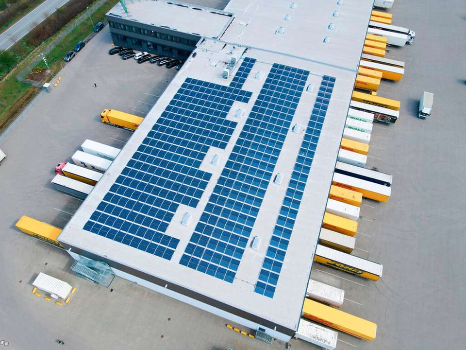 • Photovoltaikanlagen auf dem Dach der Logistikhalle von Voigt Logistik.
