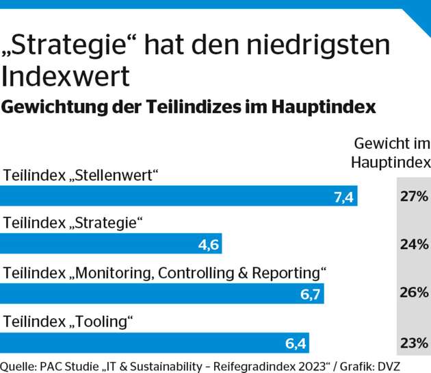 Der Teilindex "Strategie" hat mit 4,6 den geringsten Wert in der Studie. Das bedeutet, die von den Unternehmen bezeugte Wichtigkeit der ESG-Nachhaltigkeitsziele und ihrer Erreichung spiegelt sich nicht in ihren Taten, also ihrer Strategie, wider. Das lässt sich daran erkennen, dass nur 39 Prozent der Befragten definierte Unternehmensziele in Bezug auf Nachhaltigkeit aufgestellt haben. Mehr als die Hälfte der Befragten gibt das Vorhaben an, zwischen 2030 und 2040 CO2-neutral zu werden – allerdings fehlen die konkreten Strategien für den Weg dahin bei einigen noch.